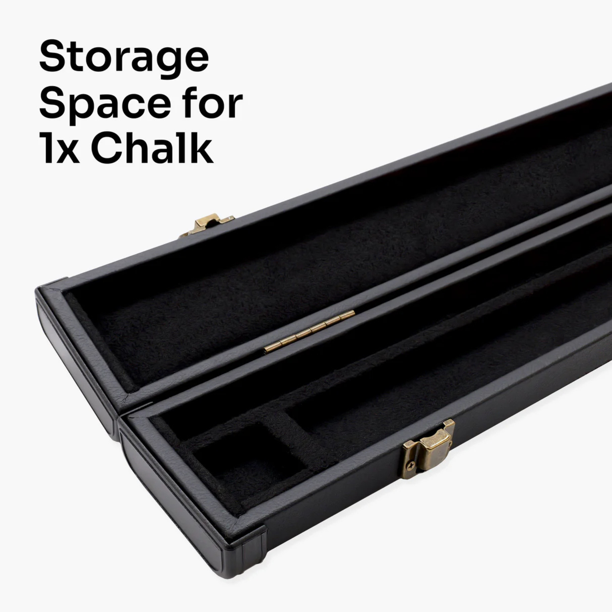 Inside, your cue is cradled by a soft, suede-style padded interior that keeps each section snug and secure. A built-in divider ensures the shaft and butt remain separate, preventing contact and damage during transport. There’s even a handy compartment to store one piece of chalk, keeping your accessories organised and within easy reach.
