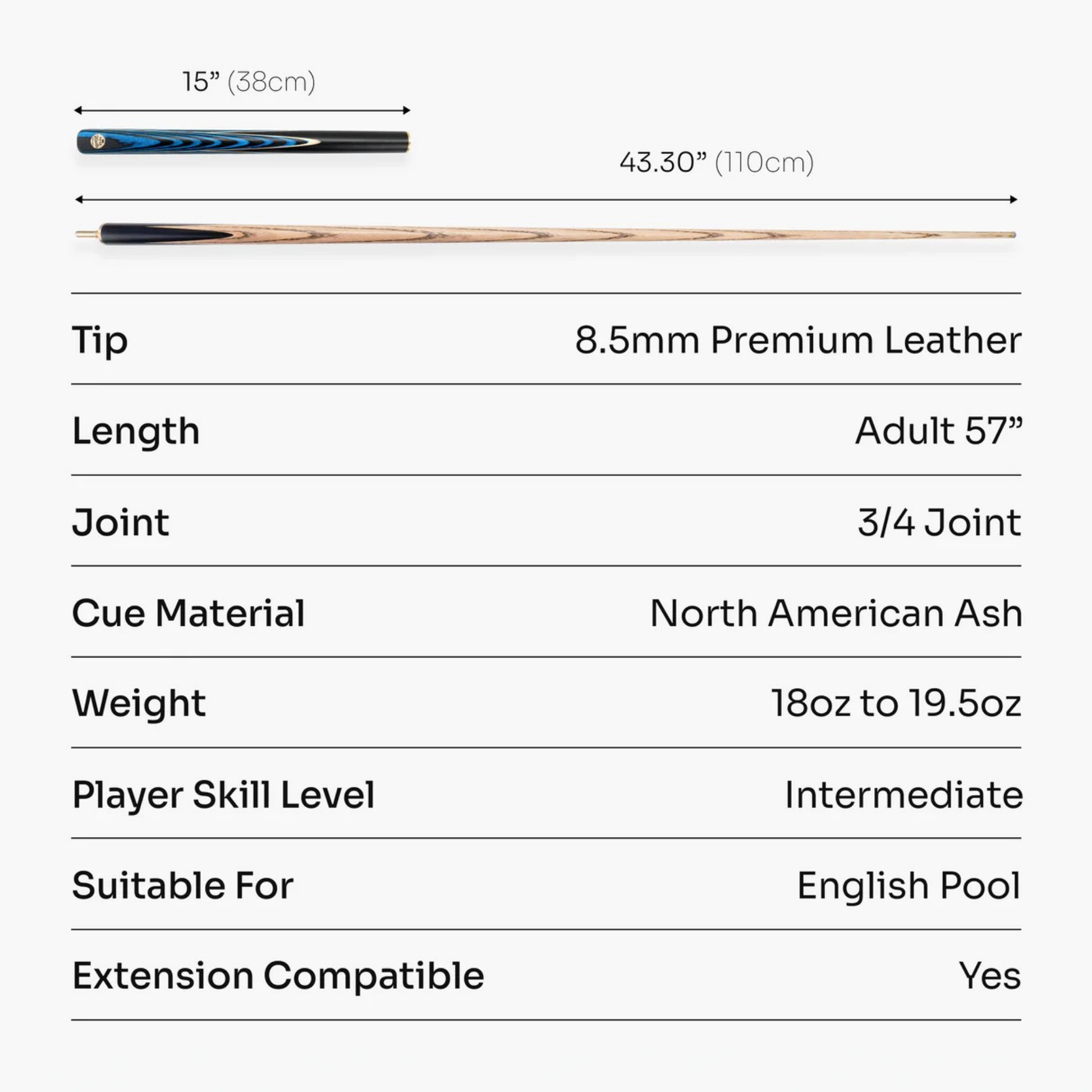 The Azure Marksman from the Baize Master Marksman collection is engineered for serious English pool players who focus on cue-ball control and potting precision. With a 57″ length and a ¾ joint format, this cue delivers both shot feel and practical transport convenience.