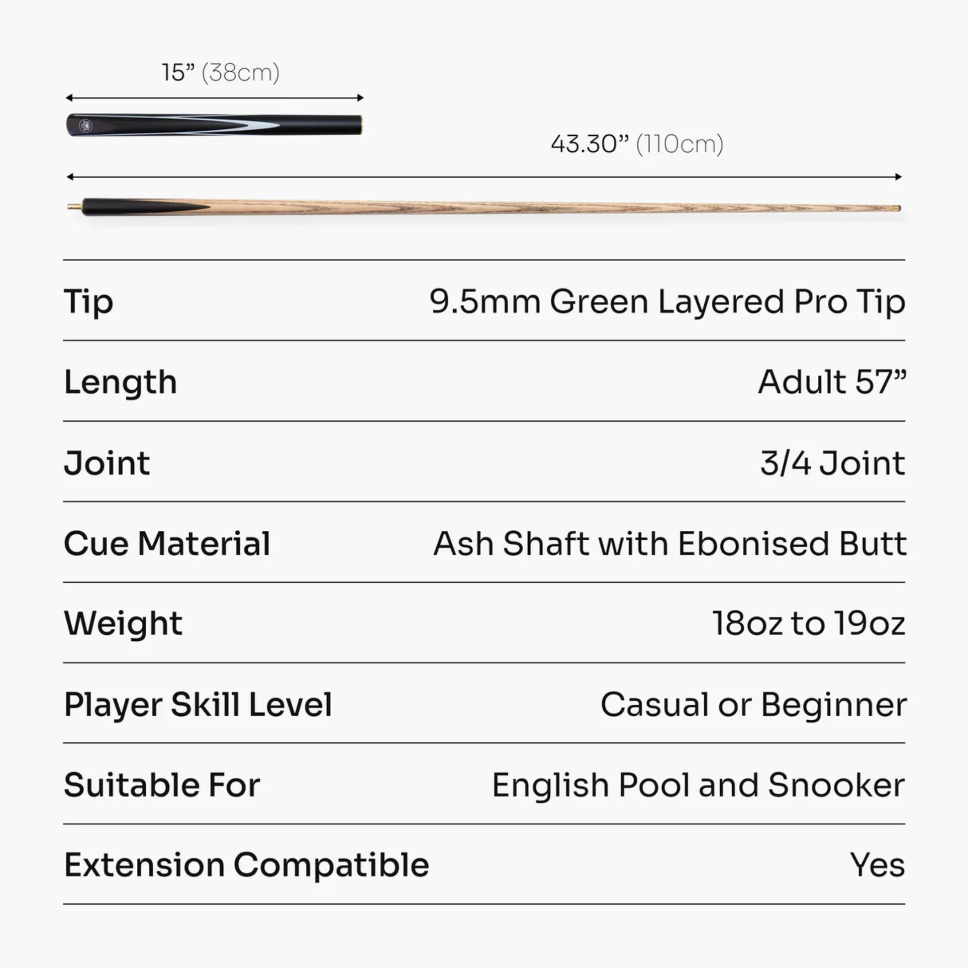 ¾-length cue (~57″) with brass vacuum joint, suitable for both snooker and pool.